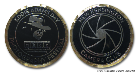 The Limited Edition (100), Eddie Adams Day Commemorative Coins. The Coins feature a design created by graphic designer and New Kensington Camera Club President, Don Henderson of Henderson Graphic Design & Illustration of New Kensington, PA, featuring Eugene Pierce's epic photo of Eddie Adams.