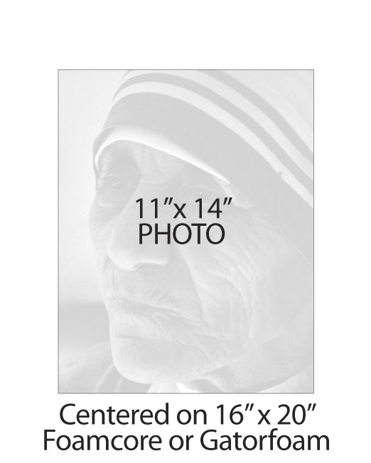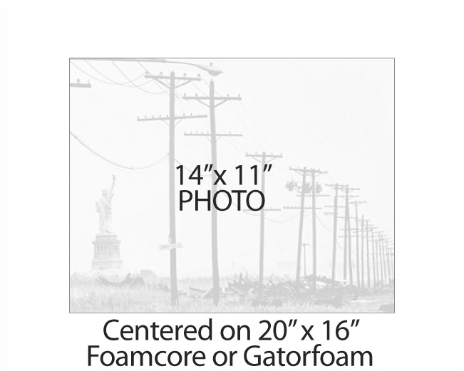 Photo size is 11" x 14" centered in a white 16" x 20" area mounted on foam core or gator board.